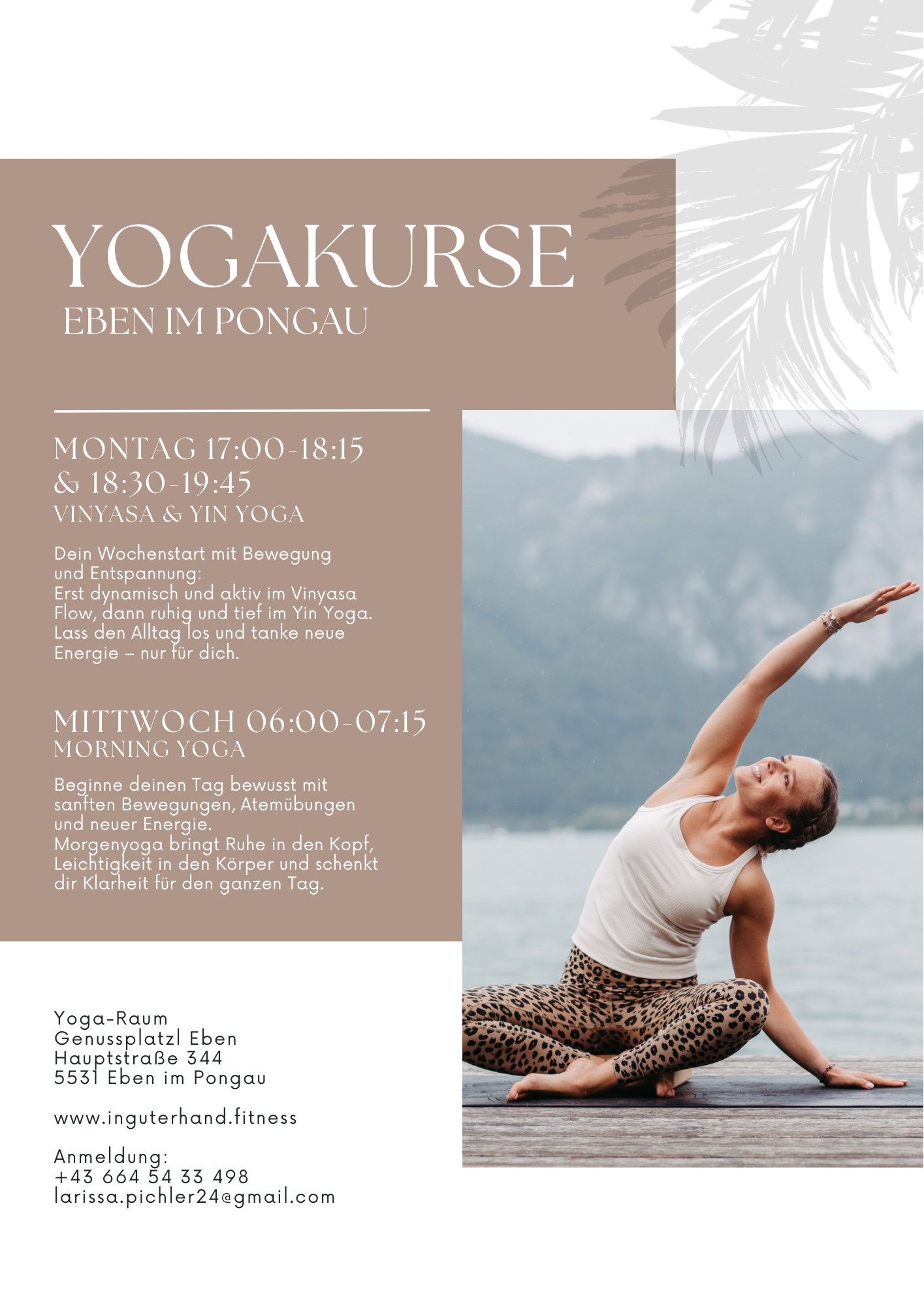 | Vinyasa & Yin 17.00-18.30 im Genussplatzl Eben | Morning Yoga 6.00-7.15 im Genussplatzl Eben | |||